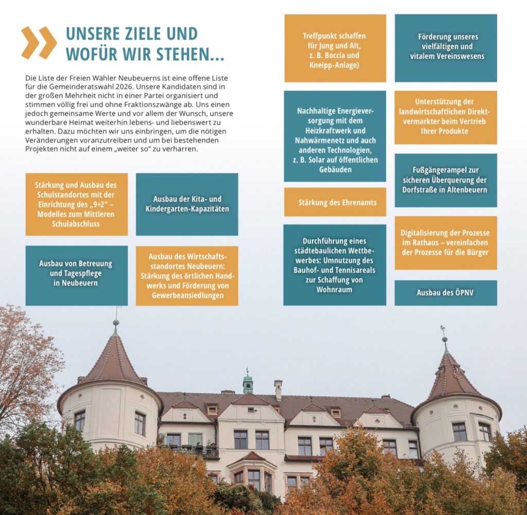 Gemeinsam mit 16 engagierten Neubeurerinnen und Neubeurern treten die Freien Wähler Neubeuern zur Gemeinderatswahl 2026 an.